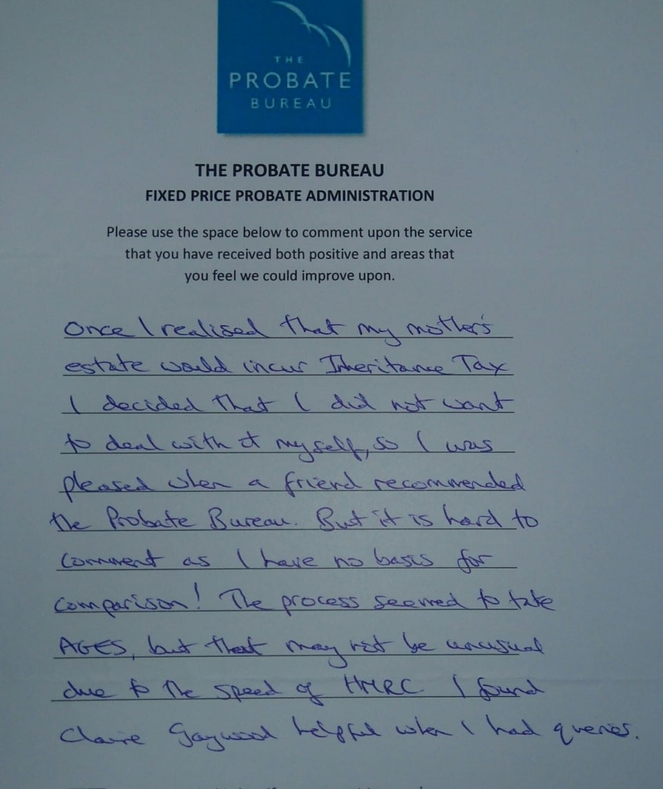 xxx and I want to express our thanks to you and your firm for all the work which you carried out for us in the administration of our mother's estate. We know it's your job and you do this all the time, but we felt we had to say how impressed we have been with the work The Probate Bureau do and in particular how you, yourself have dealt with us. nothing has been too much trouble and you have always taken time to talk, even though you must have many other people to deal with.